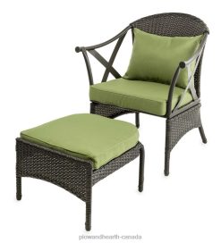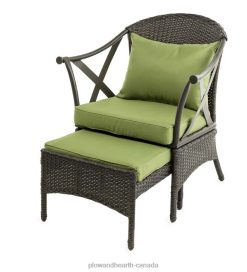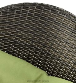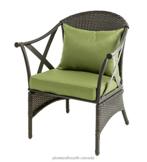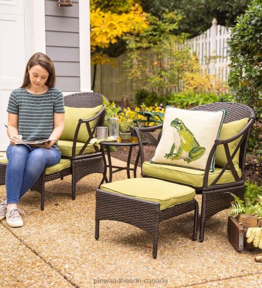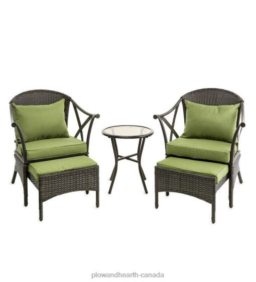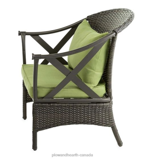 Durable and all-weather, the sturdy steel frames are wrapped in a rich brown resin wicker. Green polyester outdoor cushions have piped edges for a tailored look; zippered, removable covers are machine wash. Easy assembly. Imported.