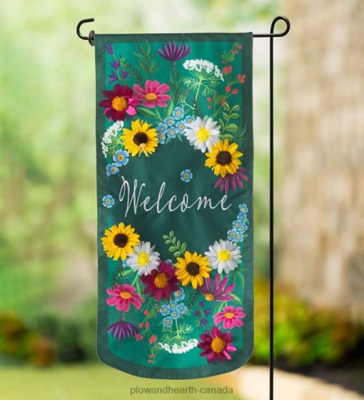 Vivid colors and wonderful wildflowers really pop against a vibrant green background with cheerful, scripted welcome message. Use this unique pennant-sized flag to bring character to your entryway, garden or landscape for the spring season or any time of year.