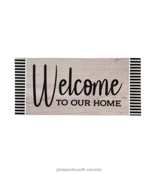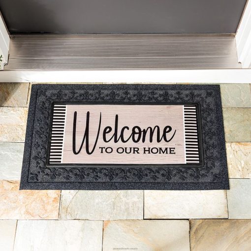 This Wood Grain Welcome Sassafras Switch Mat is an elegant way to greet guests at your entrance. A Welcome To Our Home message stands out in black letters against a wood background that gives the design a rustic look.